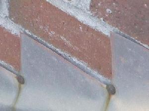 | This is a close-up of metal flashing at the roofline, with the flashing unsealed on the bricks. This allows water to penetrate the roof and attic area causing many other moisture problems. Flashing should be sealed to prevent water penetration. |
