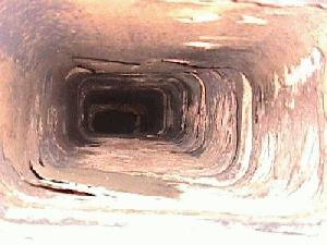 ![]() | This is a photo of a GAS furnace flue. Note the severe deterioration of the clay tile. This can be caused by several things, one of which the flue gas temperatures are not hot enough to keep the large flue temperature above it’s due point, it has literally caused the tile to flake apart. This flue should be relined with a proper size liner. |
