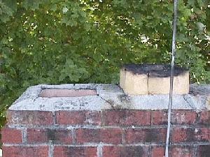 | Top view of the same chimney. Note the mortar around the recessed flue tile. It actually encourages water to enter the flue. The flue tile should extend at least two inches above the chimney crown and should have a rain cap covering the flue. |